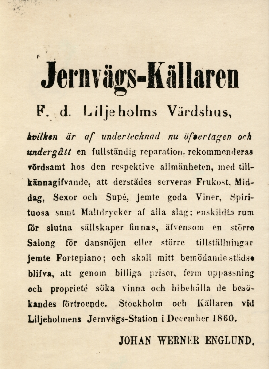 Annons om Jernvägs-källaren. F.d. Liljeholmens värdshus