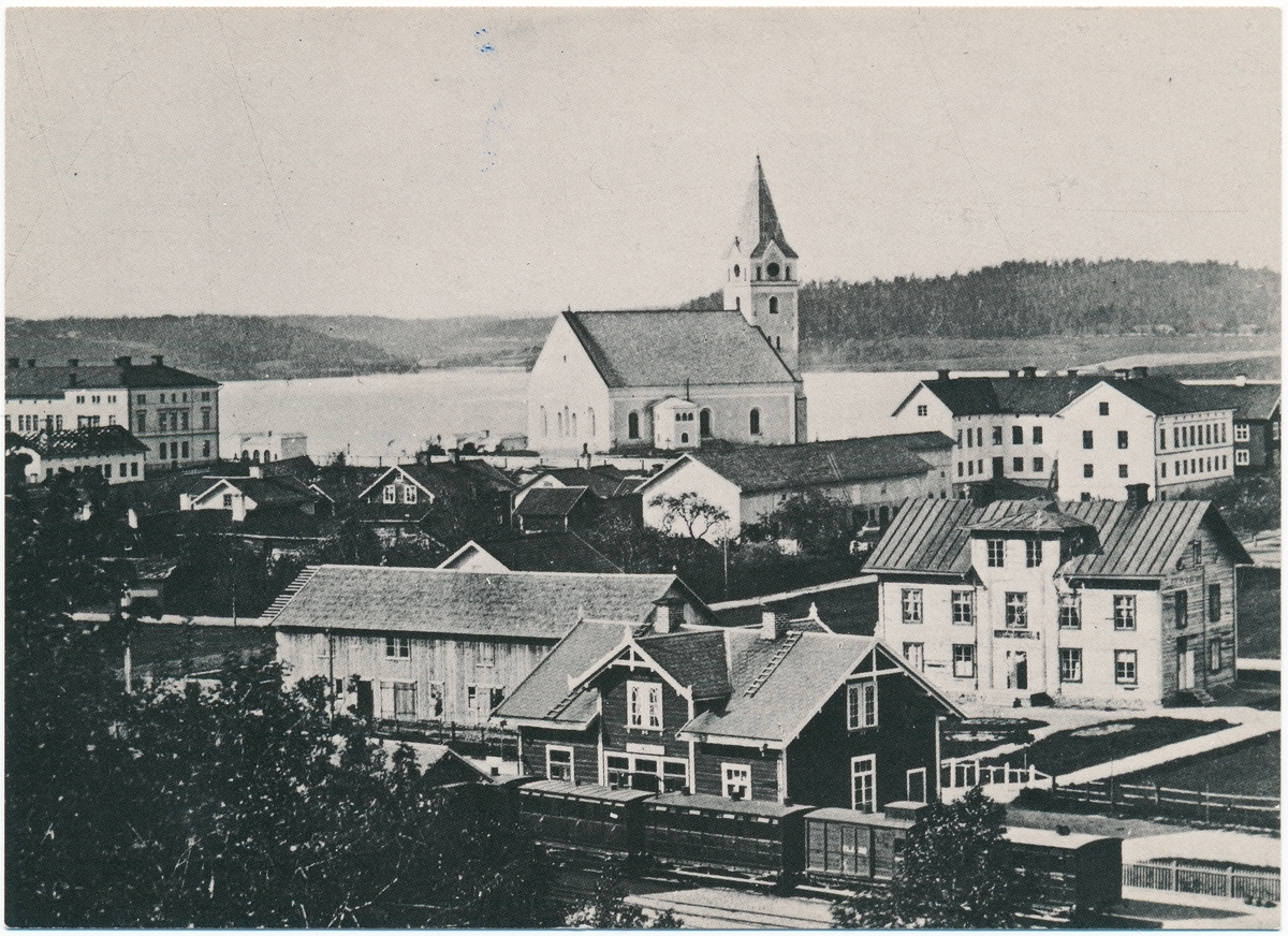 Lindesberg sedd från kyrkberget. Bilden visar stadens centrala del som återuppbyggdes efter stadsbraden 1869.