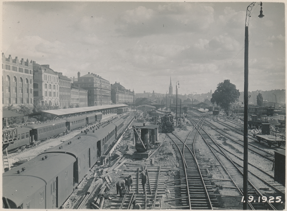 Ombyggnad av Stockholm C. Båda tågsätten till vänster tillhör Stockholm - Västerås Bergslagens Järnväg, SWB. Ångloket är ett av Statens Järnvägars, SJ Ke.