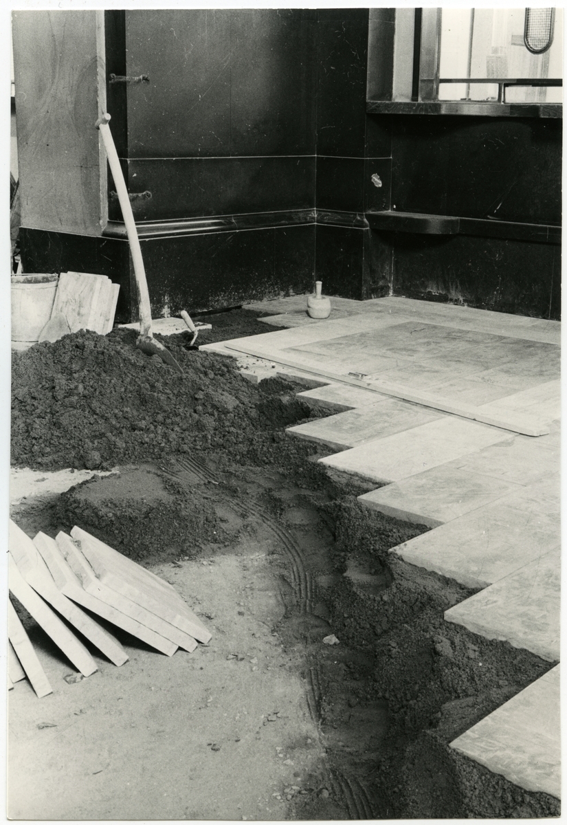 Statens Järnvägar, SJ, Stockholm centralstation ombyggnaden, plattsättning i biljetthallen.