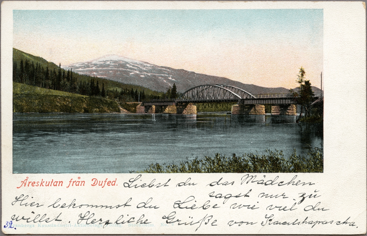 Järnvägsbro över Forsaforsen på linjen mellan Duved och Storlien med åreskutan i bakgrunden.