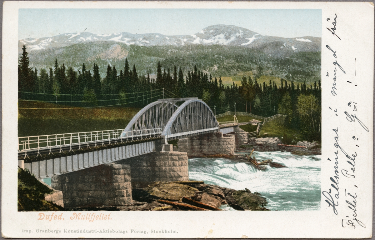 Järnvägsbro över Forsaforsen på linjen mellan Duved och Storlien med Mullfjället i bakgrunden.