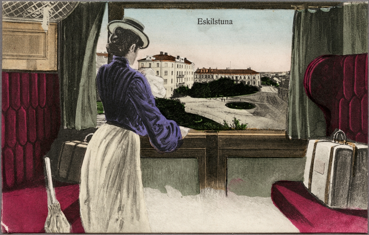 Tecknat vykort med vy över Eskilstuna.