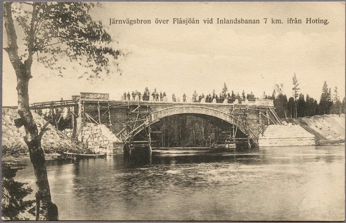 Bygge av järnvägsbro på inlandsbanan över Flåsjöån på linjen mellan Hoting och Lövberga.