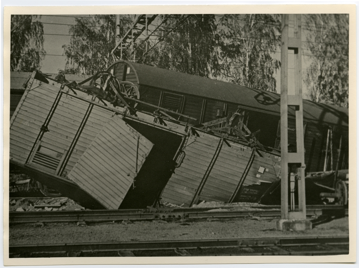 GS och G vagn på olycksplatsen i Säffle. Urspårning natten mellan 2 och 3 oktober 1948.