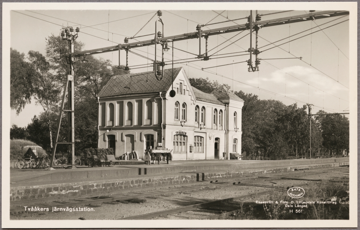 Stationsområde med vy på stationshus och perrong.