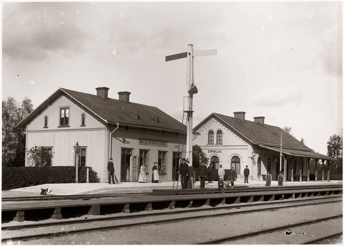 Ervalla station, föreningsstation med Nora - Ervalla Järnväg ( Nora Bergslags Järnväg, NBJ). Trafikplatsen anlades av Köping - Hults Järnväg och öppnades för trafik 5 mars 1856. Stationen övertogs av SJ, Statens Järnväg i samband med köpet av bandelen Frövi - Örebro.