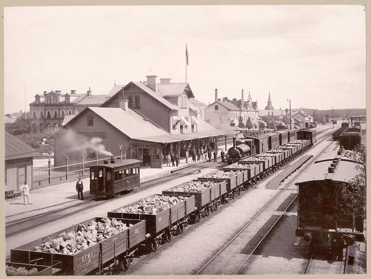Den lilla vagnen till vänster trafikerade Eskilstuna-Kvicksund år 1905 och drevs av en ångmaskin. När det var höst, så fick passagerarna stiga av och skjuta på vid stigningar, det enligt lokföraren Elis Larson. Eskilstunas första järnvägsstation stod klar år 1876, då järnvägen invigdes från Oxelösund-Flen-Eskilstuna till Valskog och Kolbäck i Västmanland - OFWJ. När Norra Sörmlands järnväg öppnades år 1895 med Norra och Södra stationerna fick OFWJ:s station namnet Centralstation. År 1924 revs det gamla huset och den nya stationsbyggnaden fick sitt nuvarande utseende.