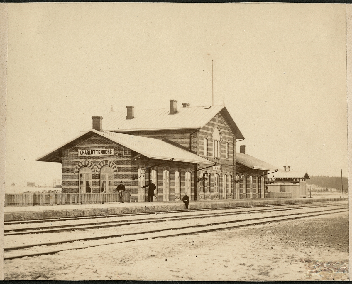 Vy vid Charlottenberg. Stationen öppnad 1865. Eldrift österut 1937, västerut mot Norge 1951.Stationshuset moderniserades och utrustades med värmeledning 1931. Lokstallet byggdes ut 1879 och 1928 och år 1937 drogs det in värmeledning. Det ena övernattninghuset, 9A, tillbyggdes 1883. I byggnaden är även tulllokalerna inrymda. Även övernattninghuset nr 8 utrustades med värmeledning 1931.Mekanisk växelförregling.Öppnad 4/11 1865. Hållplats 1/10 1994, men kvar som trafikteknisk station.