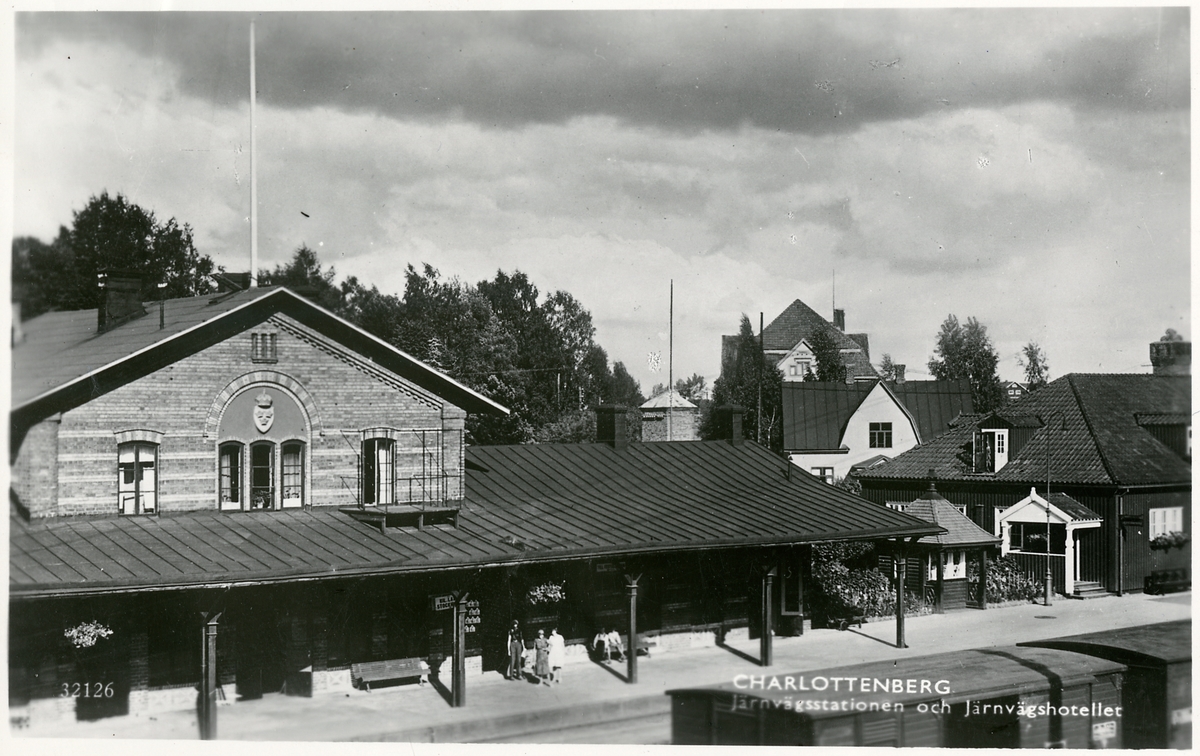 Vy vid Charlottenberg. Stationen öppnad 1865. Eldrift österut 1937, västerut mot Norge 1951.Stationshuset moderniserades och utrustades med värmeledning 1931. Lokstallet byggdes ut 1879 och 1928 och år 1937 drogs det in värmeledning. Det ena överliggningshuset, 9A, tillbyggdes 1883. I byggnaden är även tulllokalerna inrymda. Även överliggningshuset nr 8 utrustades med värmeledning 1931.Mekanisk växelförregling.Öppnad 4/11 1865. Hållplats 1/10 1994, men kvar som trafikteknisk station.