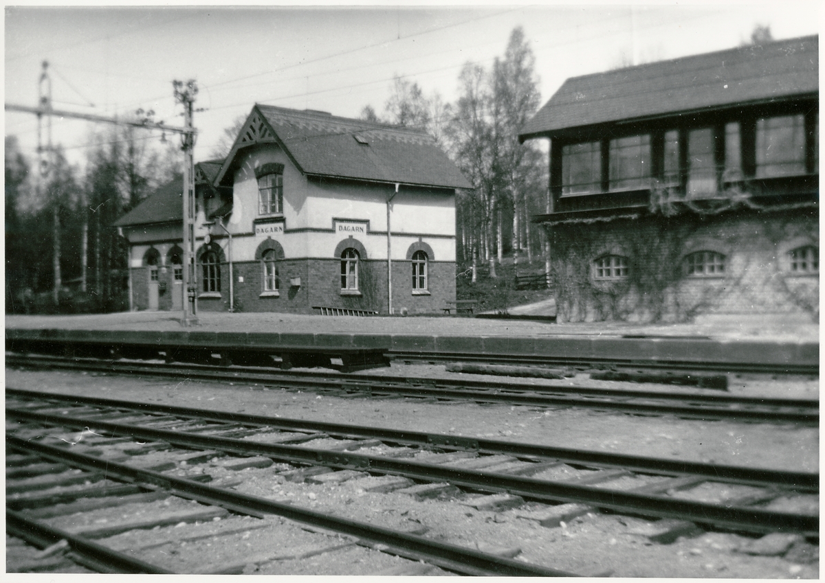 Vy vid Dagarn.Stationen anlades 1899 och i mitten av 1930-talet ombyggdes stationshuset varvid lokalerna omplacerades