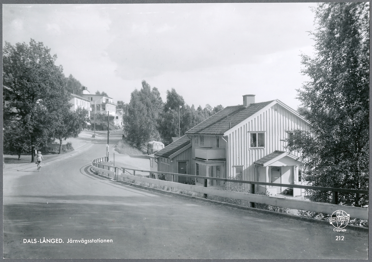 Vy vid Dals Långed. Station anlagd 1926. Tvåvånings stationshus i trä, sammanbyggt med godsmagasinet