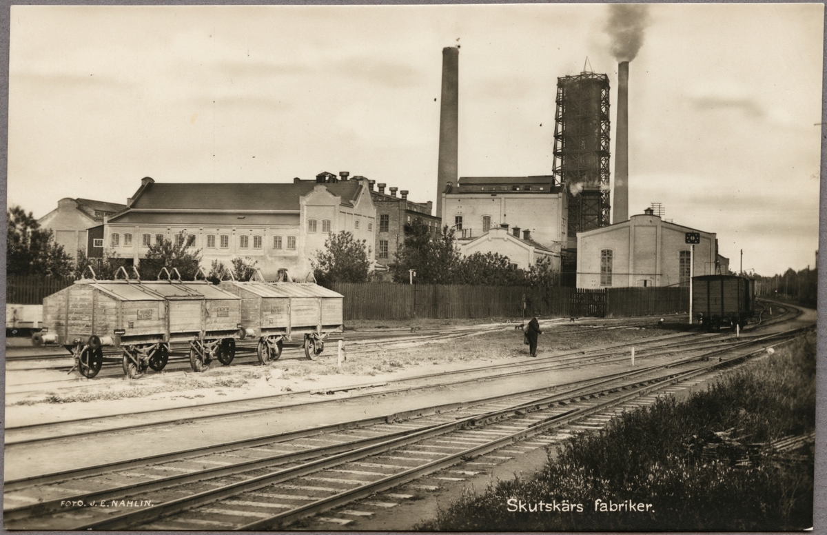 Skutskärs cellulosafabriker. Uppsala-Gävle Järnväg, UGJ kalkvagn 253 till vänster i bild.