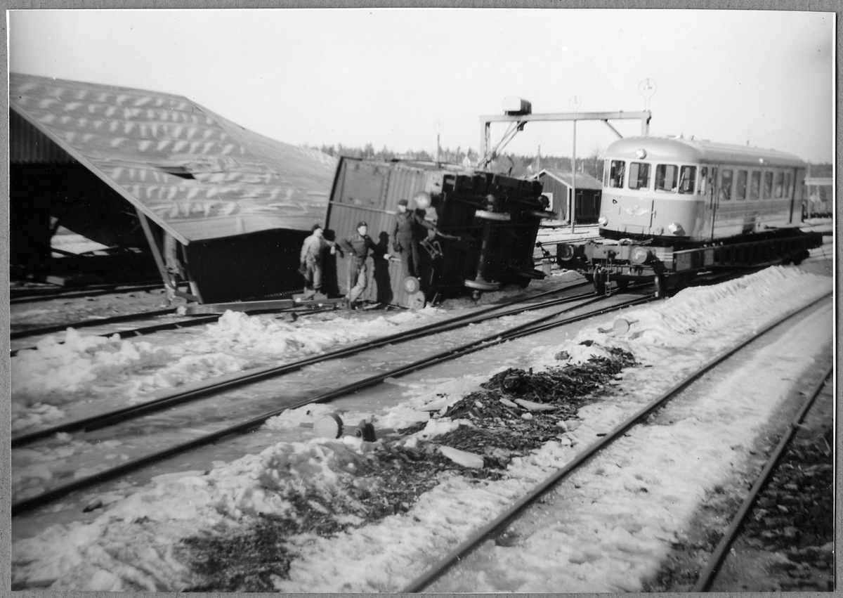 Omlastningsskjul i Åtvidaberg rasar när en godsvagn välter mot det. En överföringsvagn med en rälsbuss lastad blir skadad.