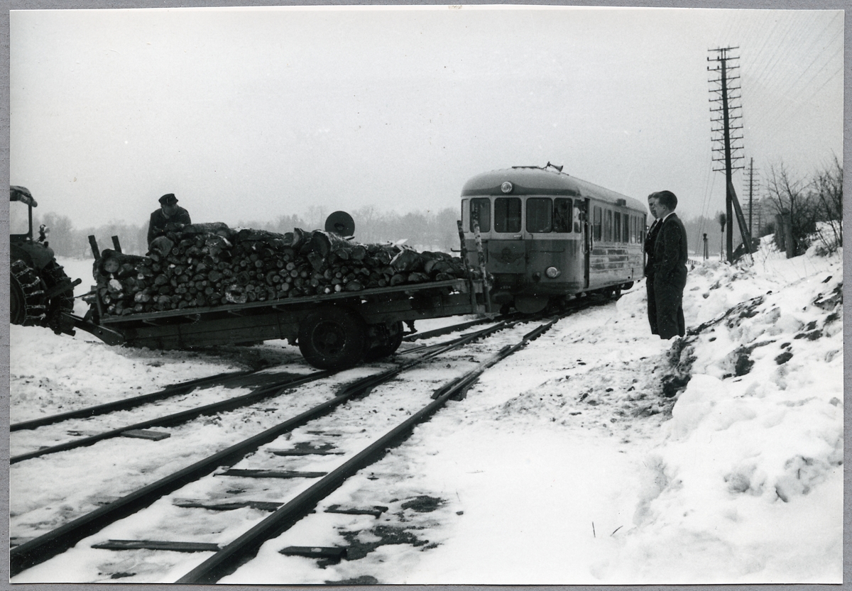 Rälsbussen Statens Järnvägar, SJ YB0a7 984 hindras av en traktor som kört fast vid en plankorsning nära Höversby station.