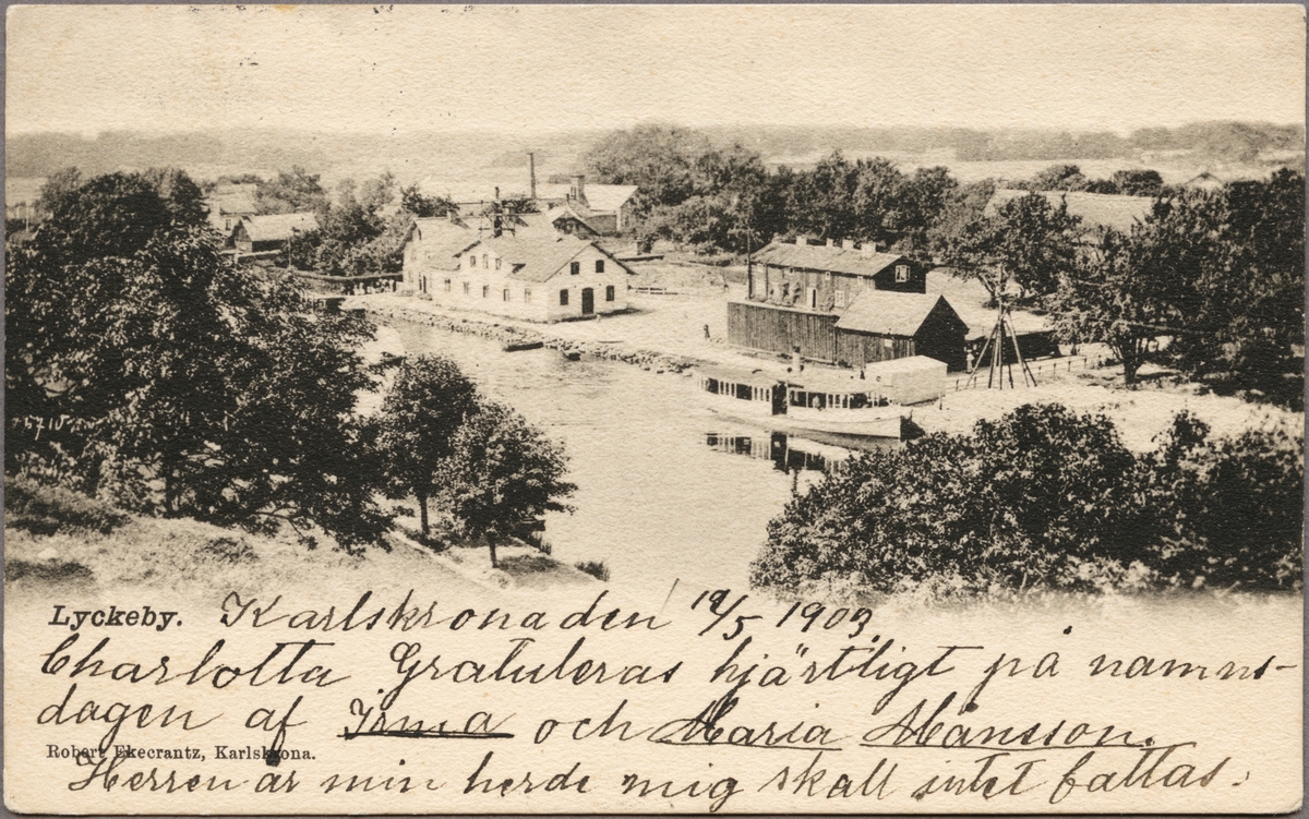 Vy över Lyckeby med en ångbåt i Lyckebyån.