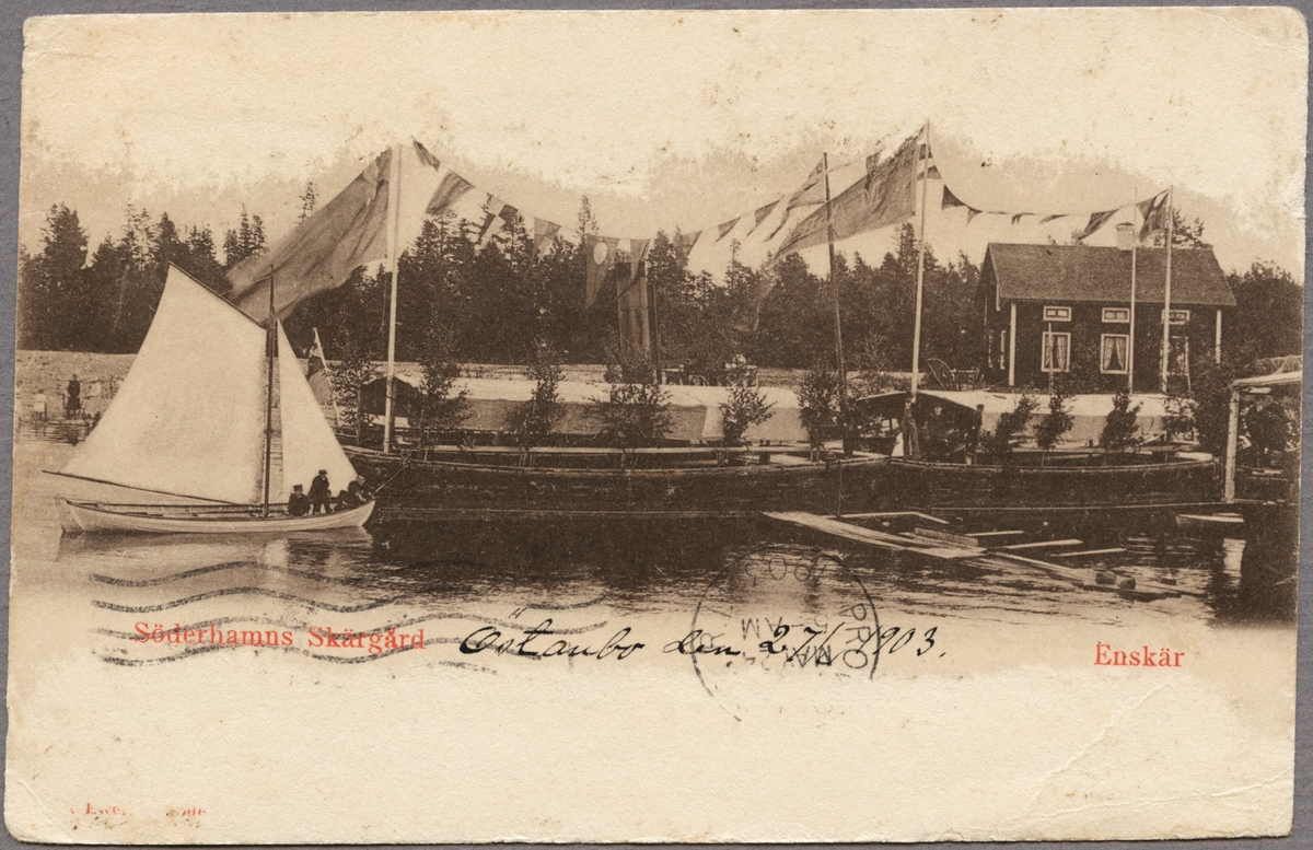 Pråmar och båtar vid kaj i Enskär.