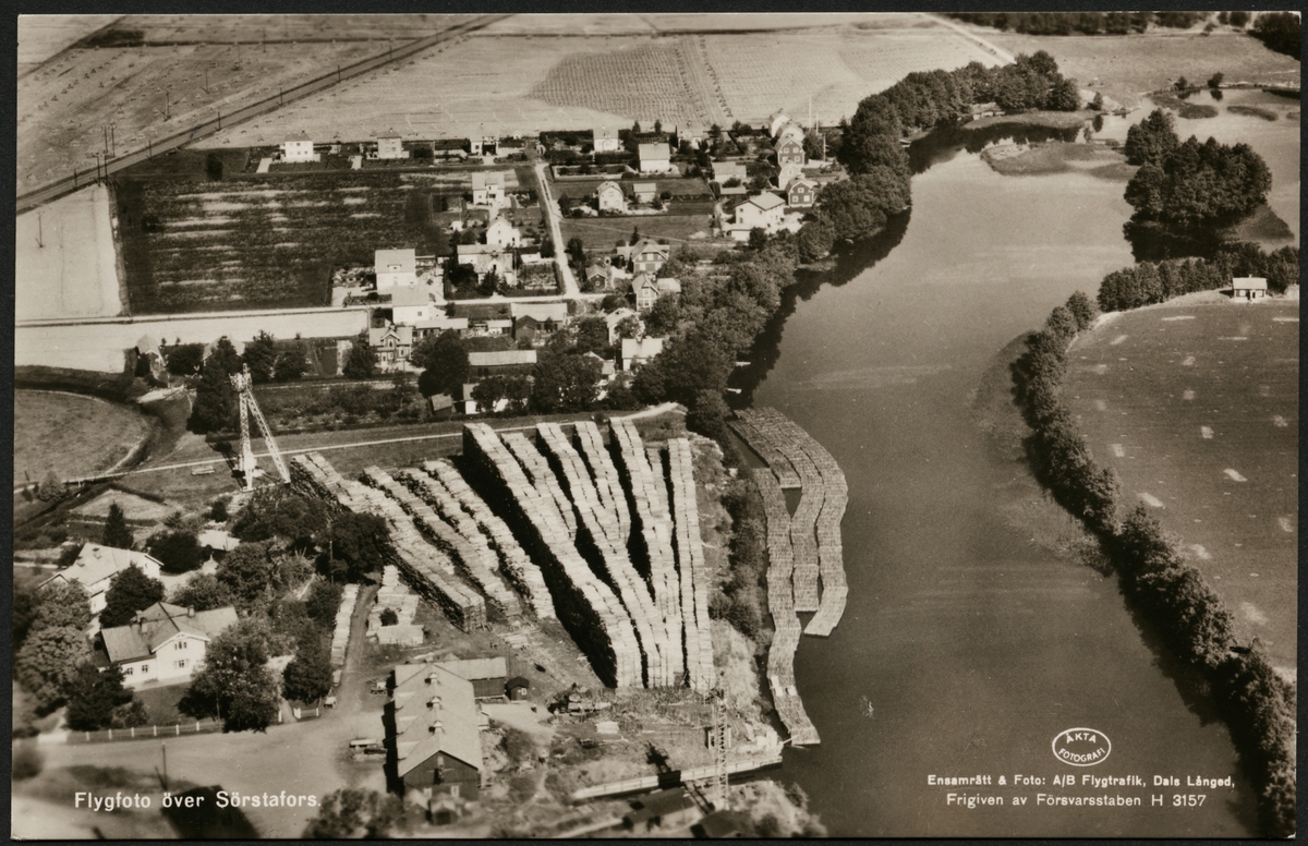 Flygfoto över timmerlager i Sörstafors vid Kolbäcksån.