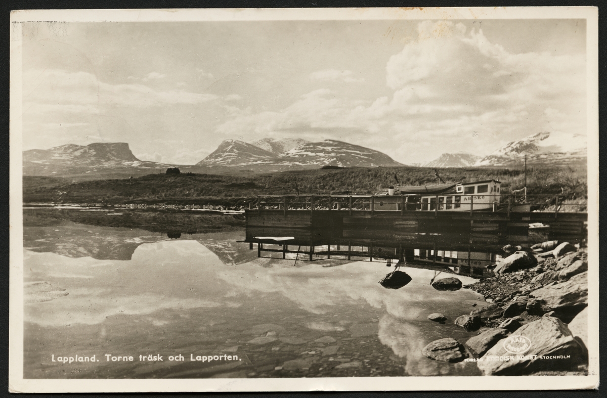 Sjön Torneträsk med brygga samt båt och bergsdalen Lapporten i bakgrunden.