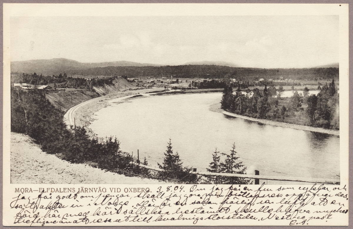 Vy på Österdalälven och del av järnvägslinjen vid Oxberg.