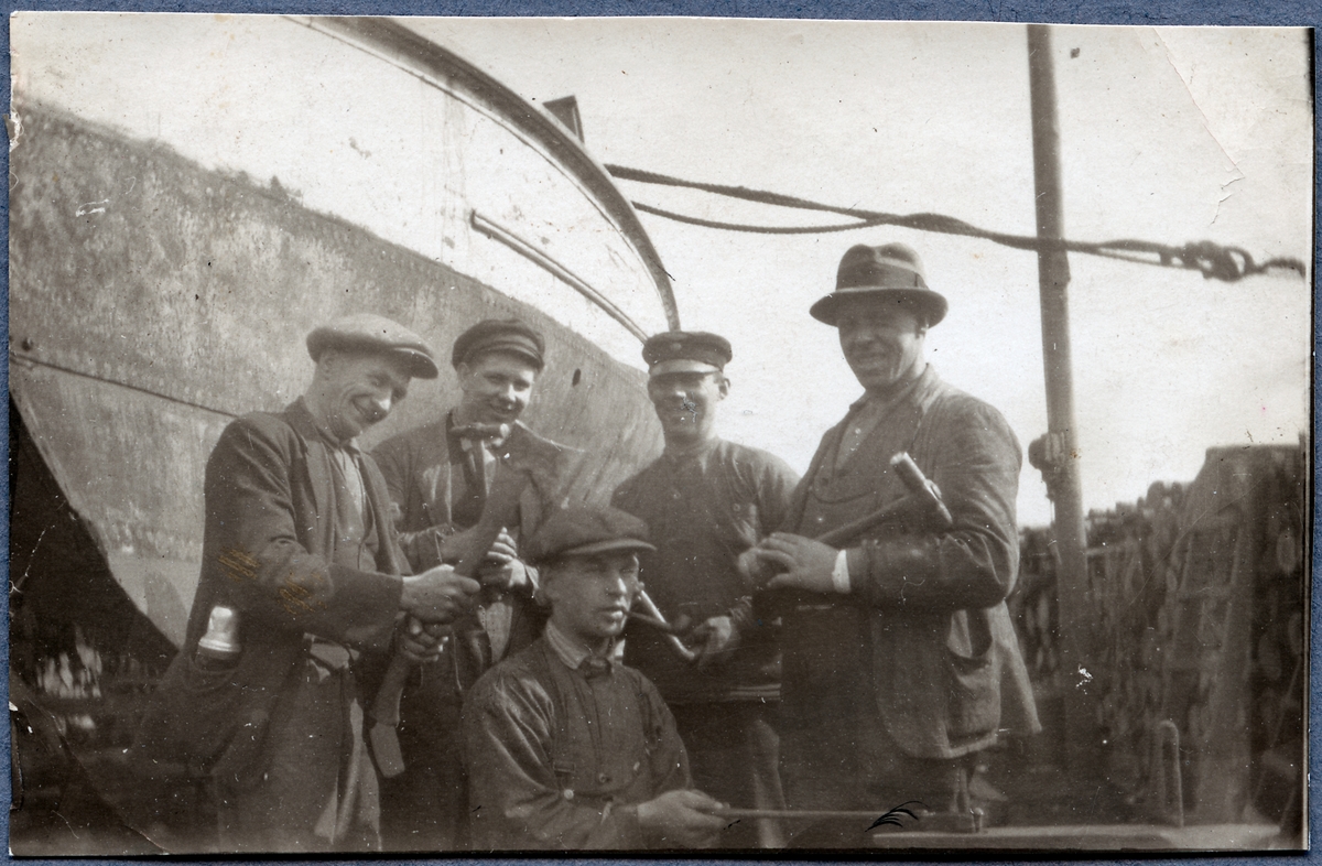 Verkstadsarbetare från Västervik under en översyn av "Kurir", Norsholm - Västervik - Hultsfreds Järnvägars ångbåt som gick sträckan Storsjö - Edsbruk.