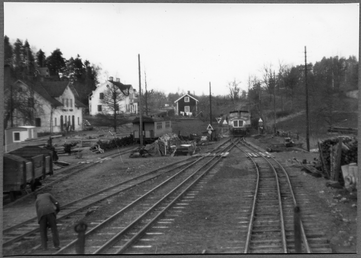 Ombyggnad av Storsjö bangård till normalspår. Gruståg som dras av Statens Järnvägar, SJ Z65 526 på väg in.