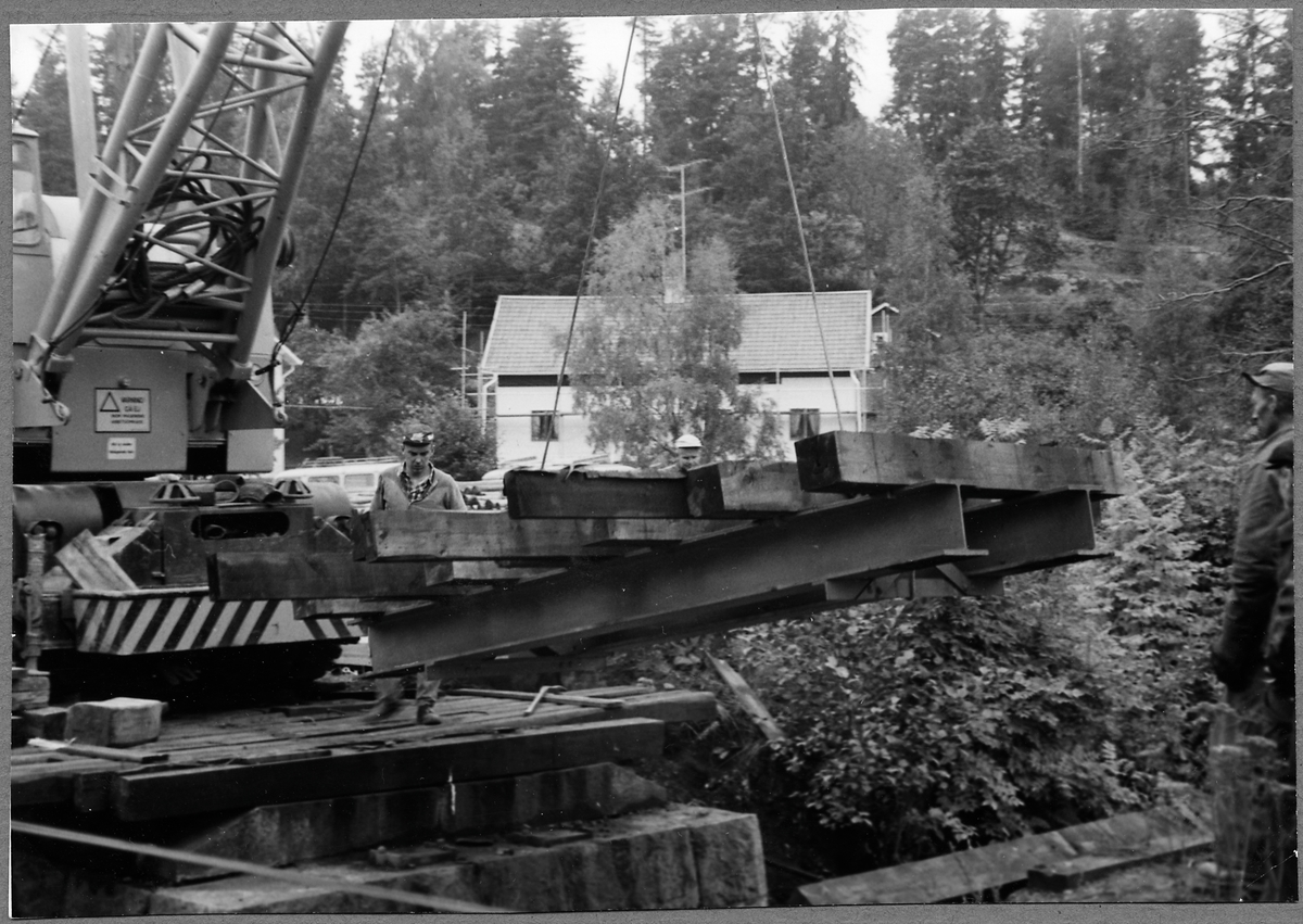 Byte av järnvägsbro över Storån vid Storsjö. Smalspårsbron lyfts bort.