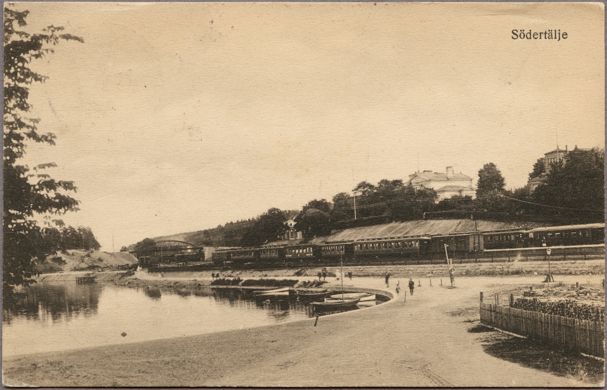Angjorda båtar på vattendrag vid järnvägslinje.