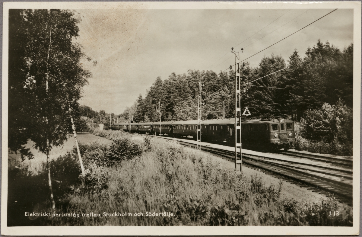 Ellok och järnvägslinje med vy på skog och elektrifierad järnväg. Statens Järnvägar, SJ Dk 314.