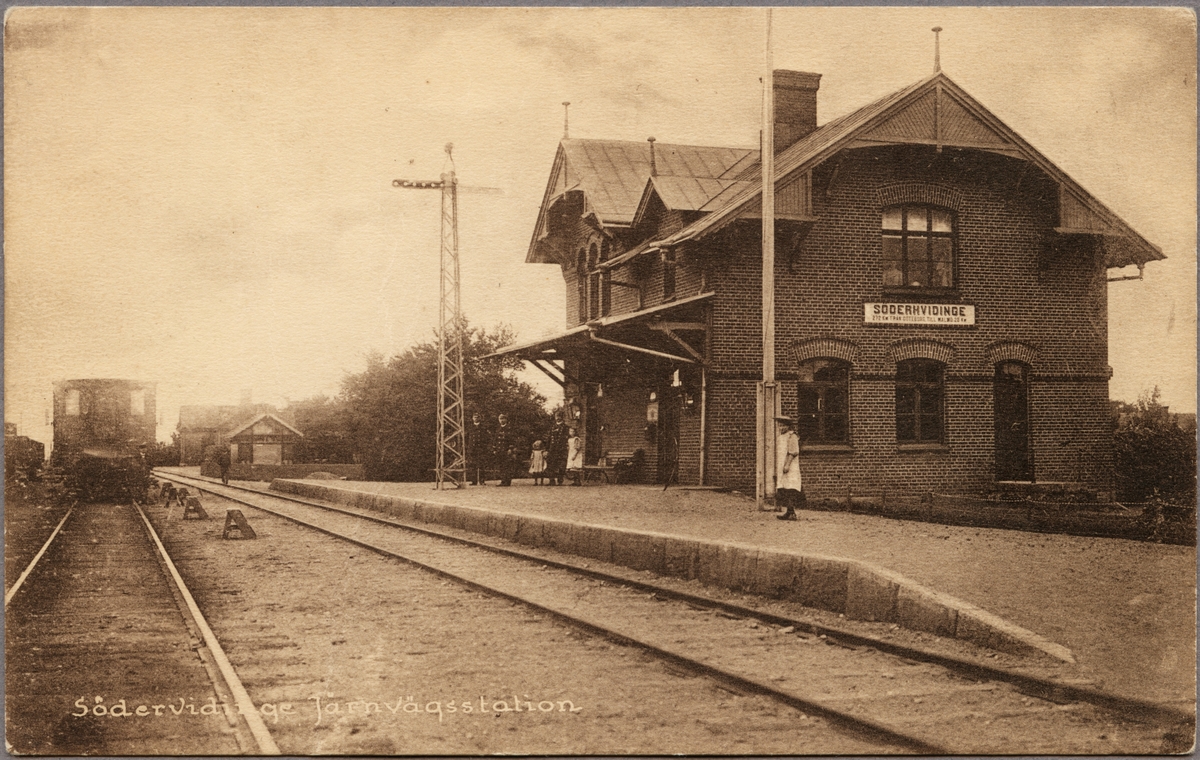 Stationsområde och bangård med vagn och personal i bild.