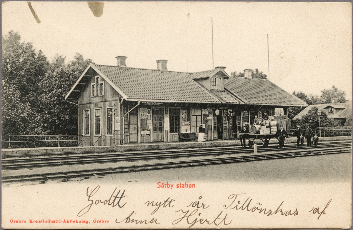 Gods på tralla med personal vid stationshus.