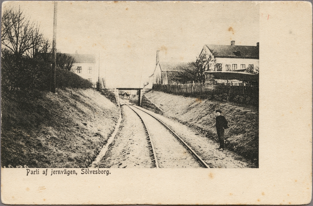 Järnvägslinje genom Sölvesborg med hus och bro i bild.
