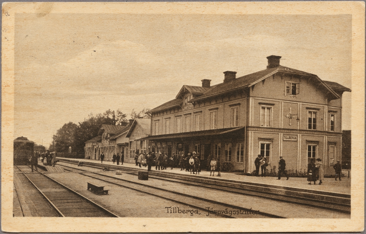 Stationsområde med stationshus och resande på perrong.