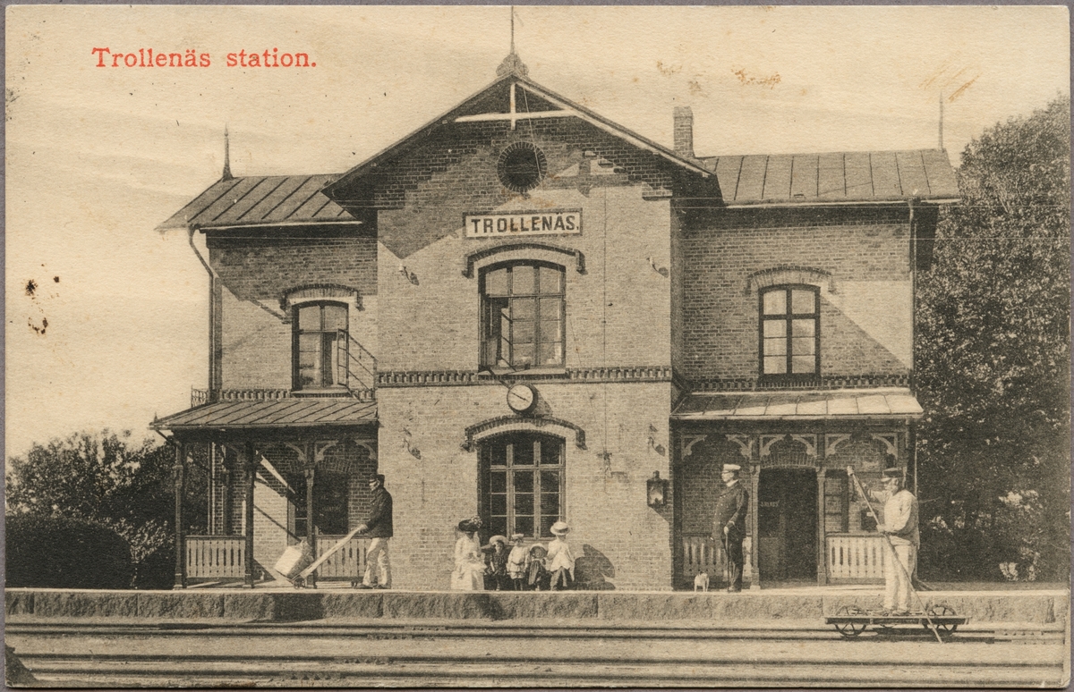 Spårsida av station med resande familj och personal vid perrong.
