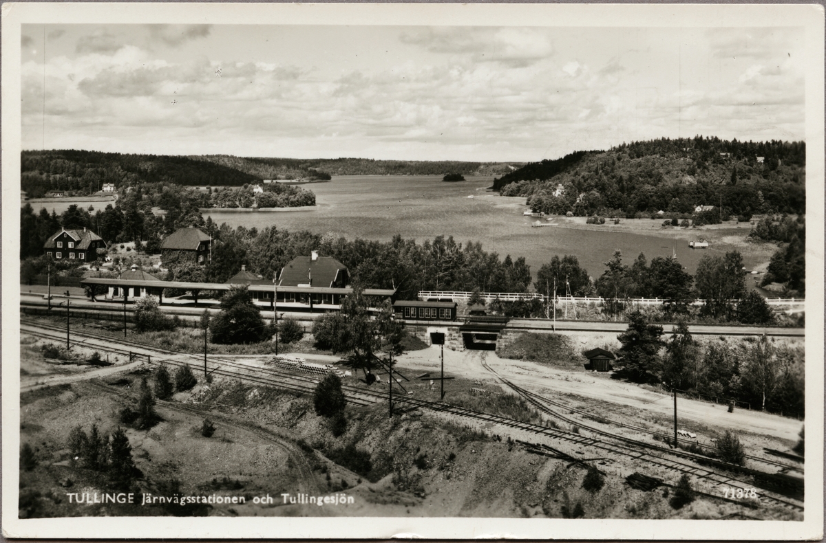 Vy på stationsområde med bangård, järnvägsbro och sjö i bakgrunden.