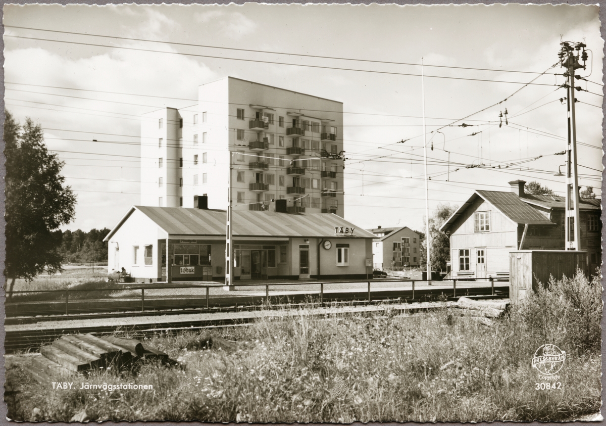 Stationsområde och elektrifierad bangård med höghus i bakgrunden.