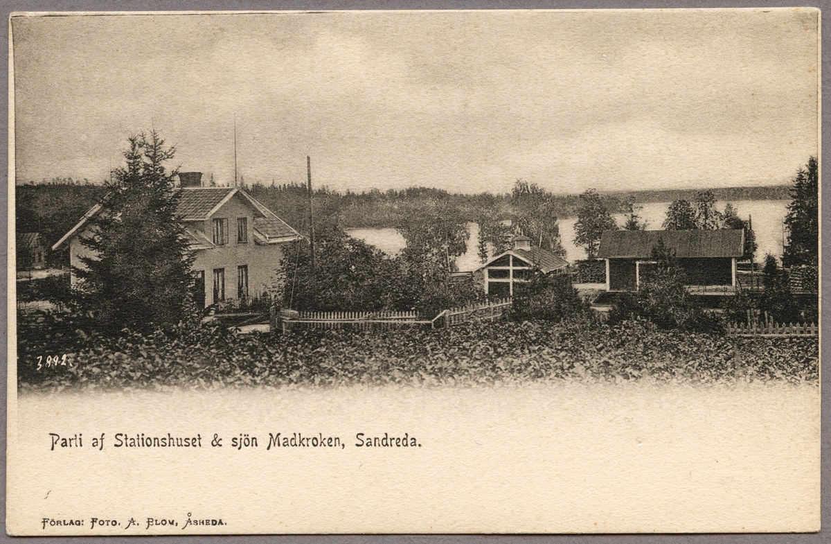 Parti av stationshuset och sjön Madkroken, Sandreda.