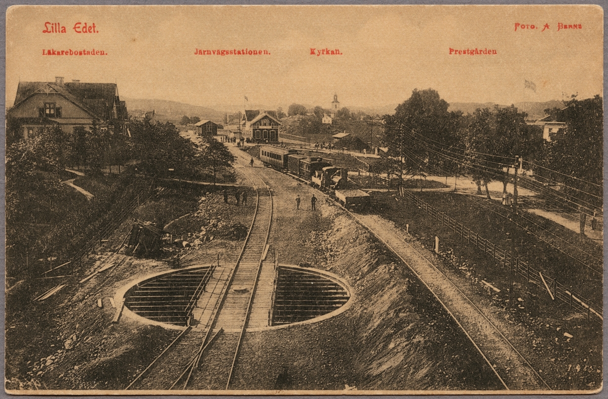 Vy på stationsområde och bangård med hus, resande och väg i bakgrunden.