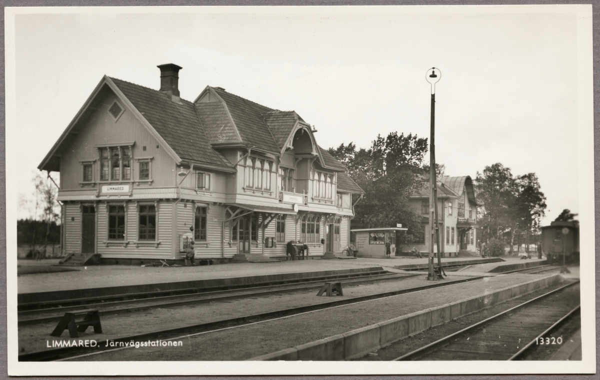 Vy på stationsområde med perrong, pressbyrån kiosk och stationshus i bild.