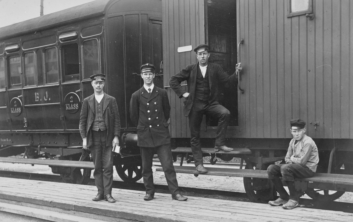 Personal framför tåg från Bergslagernas Järnvägar med bland annat en resgodsvagn samt en 2:a klass personvagn.