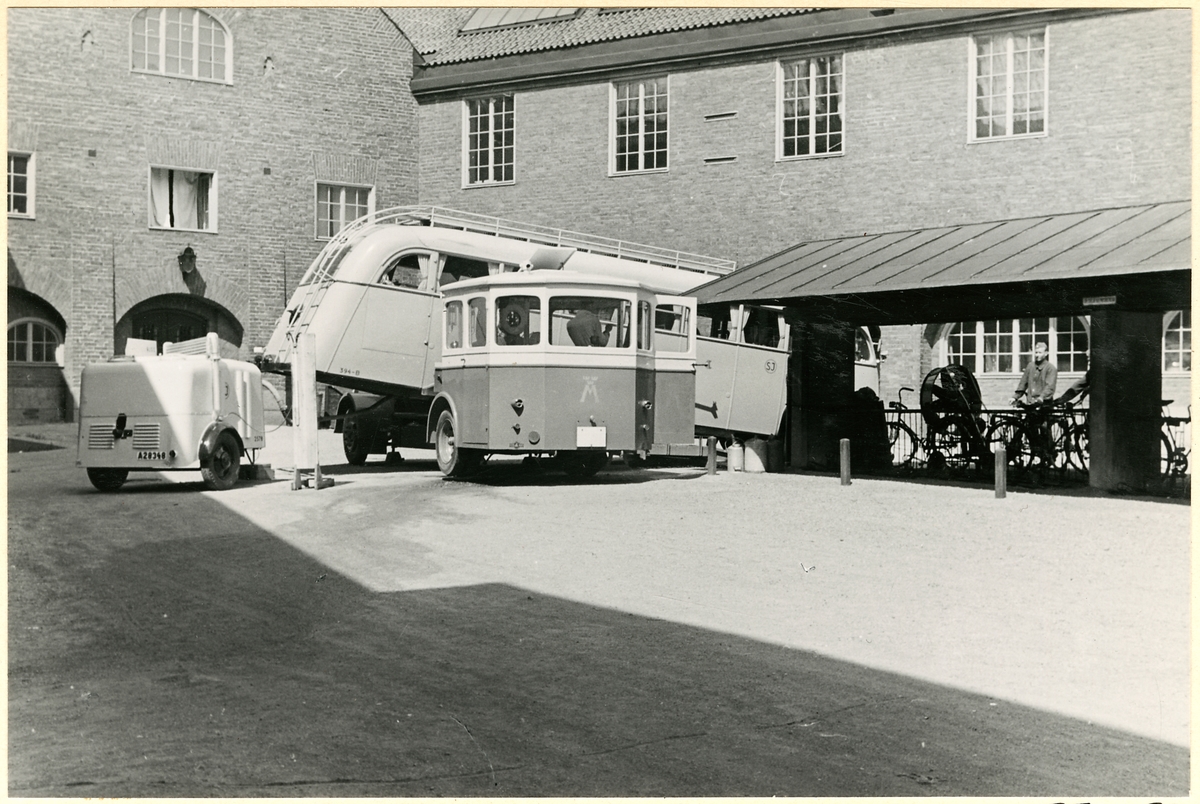 Statens Järnvägar, SJ buss 394-A lyfts upp en truck.