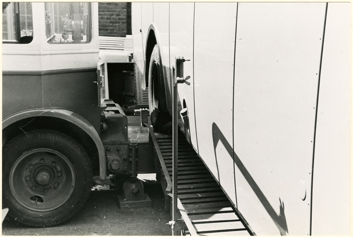 Titel: Bakändan på en buss lyfts upp med hjälp av en truck.