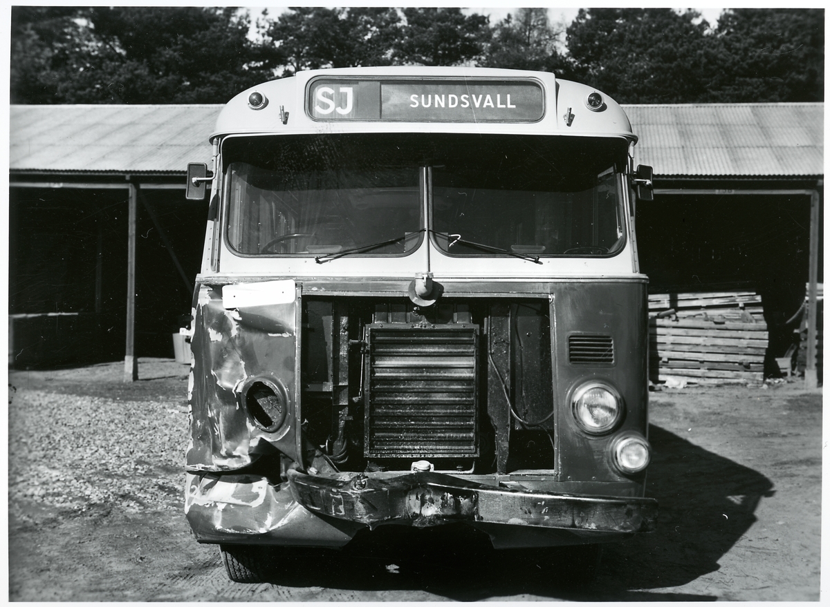 Titel: Scania-Vabis B62 buss väntar på reparation vid Svenska Karosseriverkstäderna, SKV. Statens Järnvägar, SJ buss 2200.