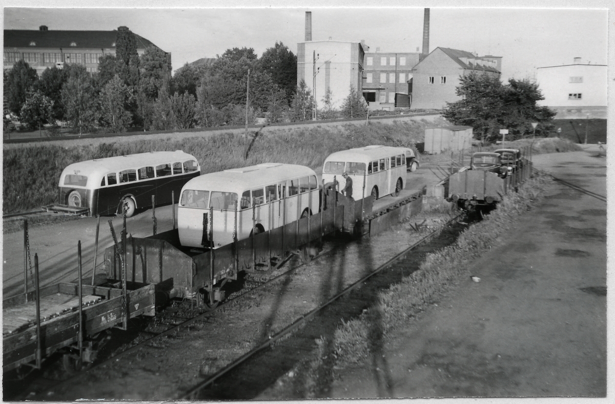 Bussar, släp och bilar fraktas på järnväg.