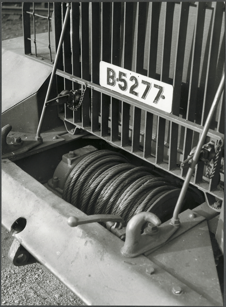 Frontparti med bogserlina, på Statens Järnvägsar´s bogserbil vid Hagalund.