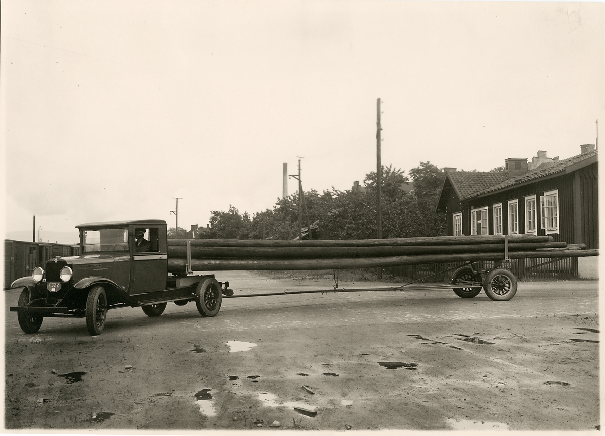 Titel: Chevrolet lastbil med vändskiva och släpkärra för långgods fraktar telefonstolpar.