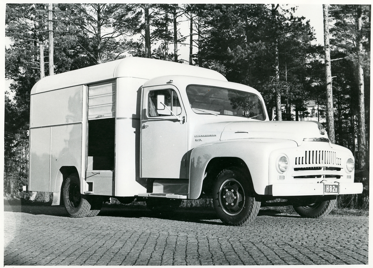 Titel: Lastbil International Harvester L-Series årsmodell 1949-1952 chassi med påbyggt skåp.