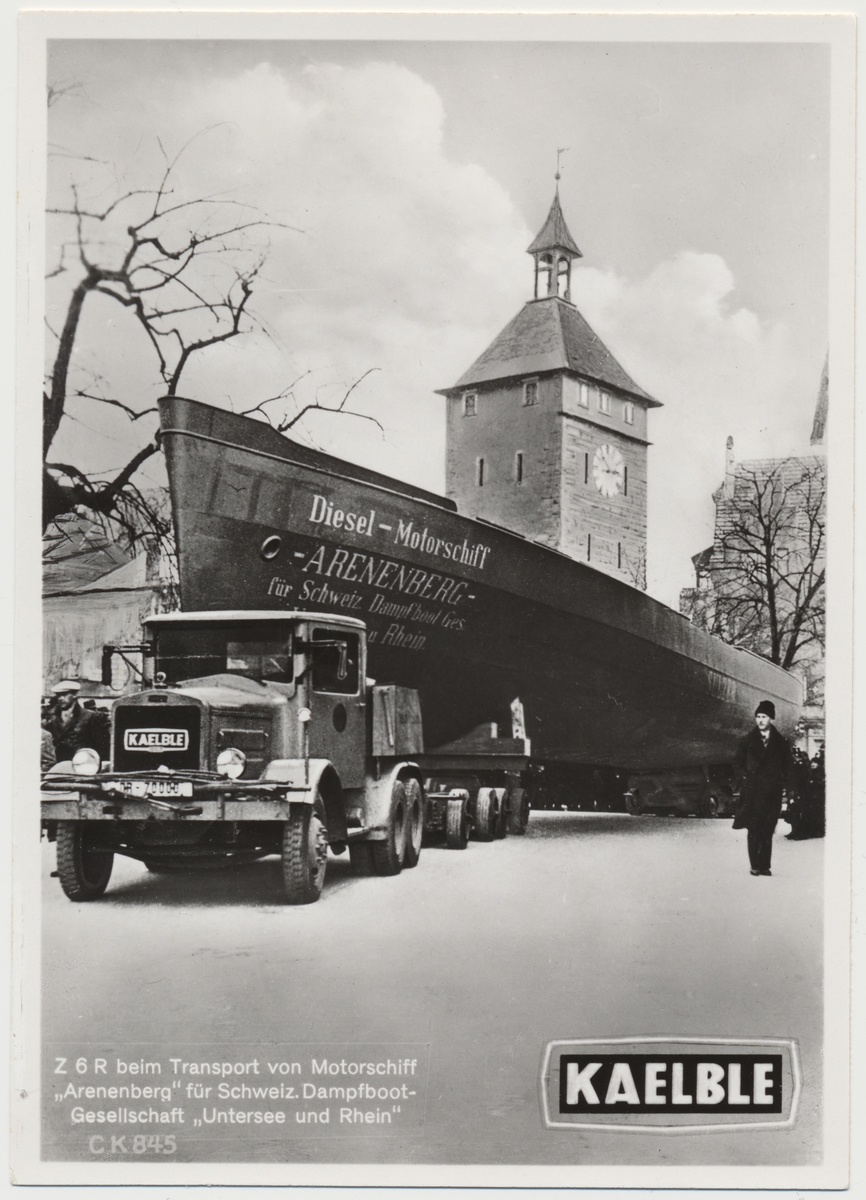 En Kaelble lastbil transporterar motorskeppet Arenenberg med trailer.