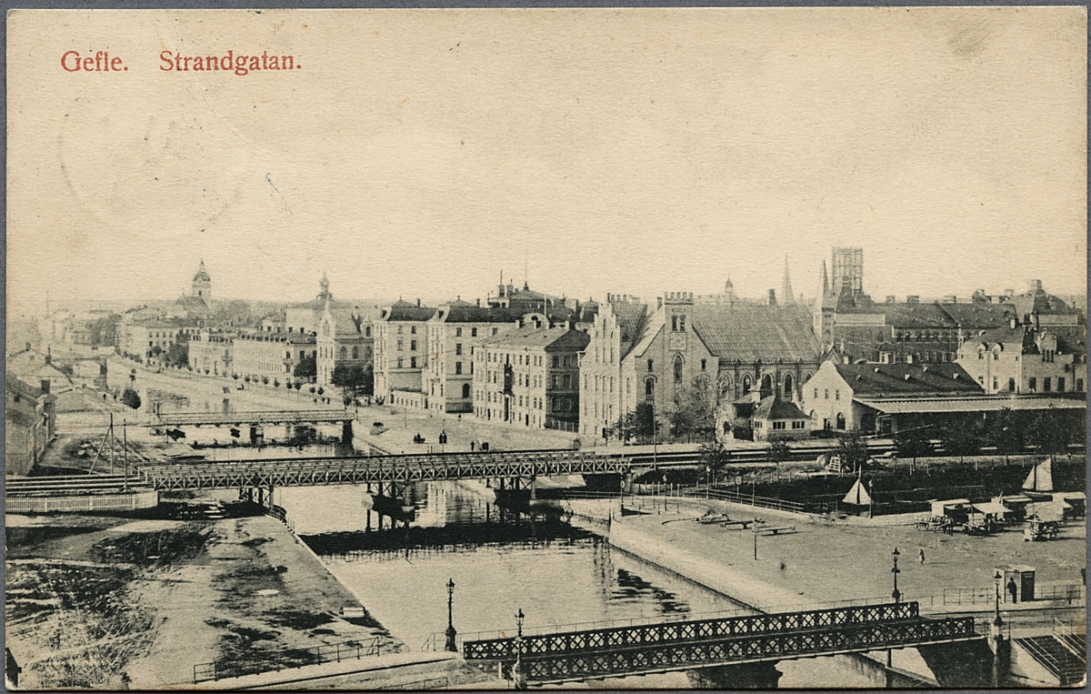 Vy över Gävle med Gavleån och Strandgatan. Gävle Centralstation i bildens högerkant.