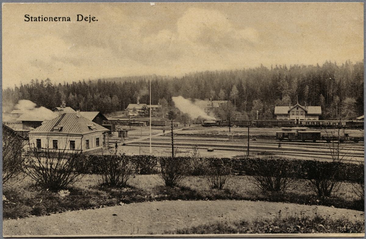 De båda stationshusen i Deje. I förgrunden syns Karlstad - Munkfors Järnvägs stationshus och i bakgrunden Bergslagernas Järnvägs stationshus.
